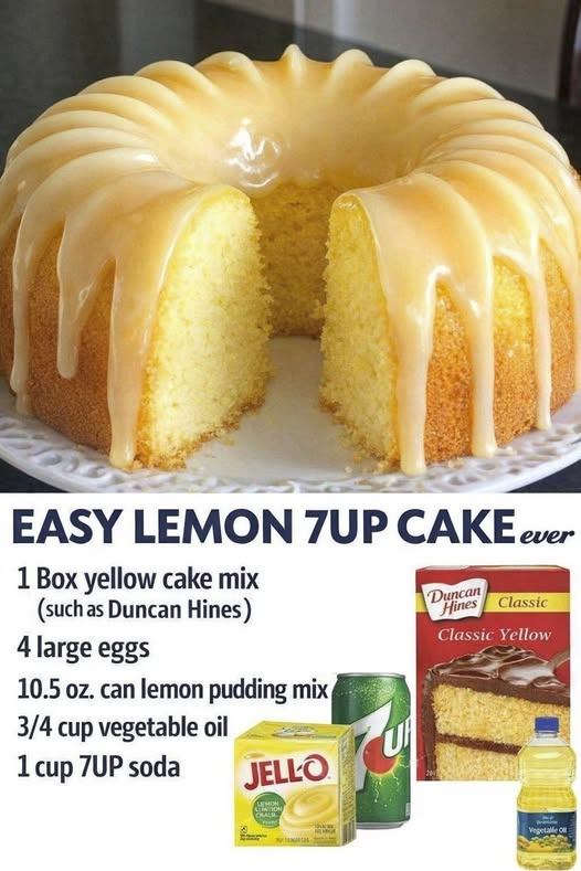 Lemon 7UP Cake is a nostalgic, ultra-moist dessert with bright citrus flavor and a tender crumb that melts in your mouth. Using 7UP soda is the secret behind its iconic texture—light, airy, and perfectly soft. With its beautiful golden color, refreshing lemon aroma, and classic taste, it’s a cake that brings joy to any table. Whether served with glaze or simply dusted with sugar, this timeless recipe is guaranteed to impress family, friends, and anyone who loves a good old-fashioned Southern dessert. It’s simple, comforting, and absolutely delicious—slice after slice.