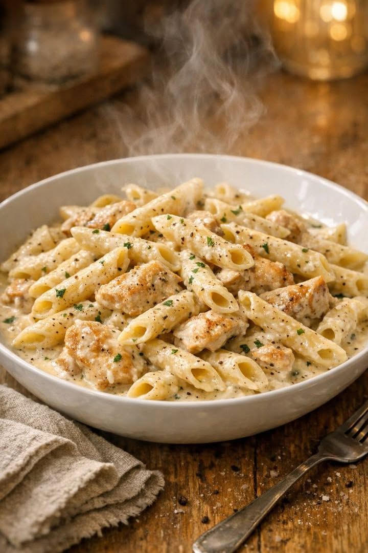 For picky eaters, keep the sauce plain and offer toppings at the table—bowls of extra Parmesan, a little crumbled bacon, or even some shredded mozzarella can make it more fun for kids to customize their own plates. If your family likes veggies mixed in but you don’t want to scare off the selective eaters, stir in a cup of frozen peas or finely chopped steamed broccoli during the last 10 minutes of cooking; they soften quickly and blend right into the pasta. For a lighter version, you can use one jar of Alfredo sauce and replace the second jar with an extra cup of chicken broth plus 1/2 cup milk, then add a bit more Parmesan at the end for flavor. If you prefer dark meat, boneless, skinless chicken thighs work beautifully and stay very tender in the slow cooker. To add a little extra flavor for grown-ups, sprinkle in some black pepper and a pinch of red pepper flakes at the table instead of mixing it into the whole pot. This dish also reheats well, but the sauce can thicken in the fridge—just stir in a splash of milk or broth when warming leftovers to bring it back to that creamy, just-made texture.