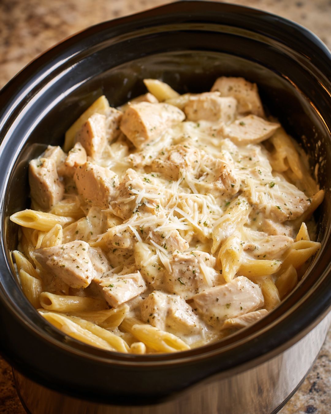 Return the shredded chicken to the slow cooker and stir to combine. Cover and cook on HIGH for 20–30 minutes, stirring once halfway through, until the penne is tender but not mushy.