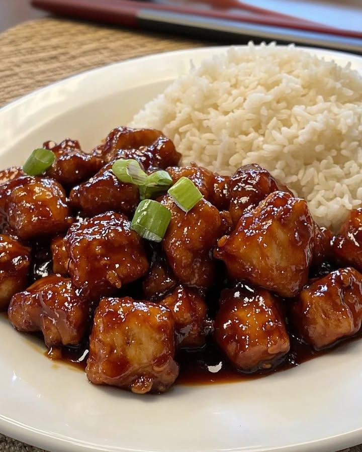 6. Serve the chicken over rice, garnished with sliced green onions and sesame seeds.
